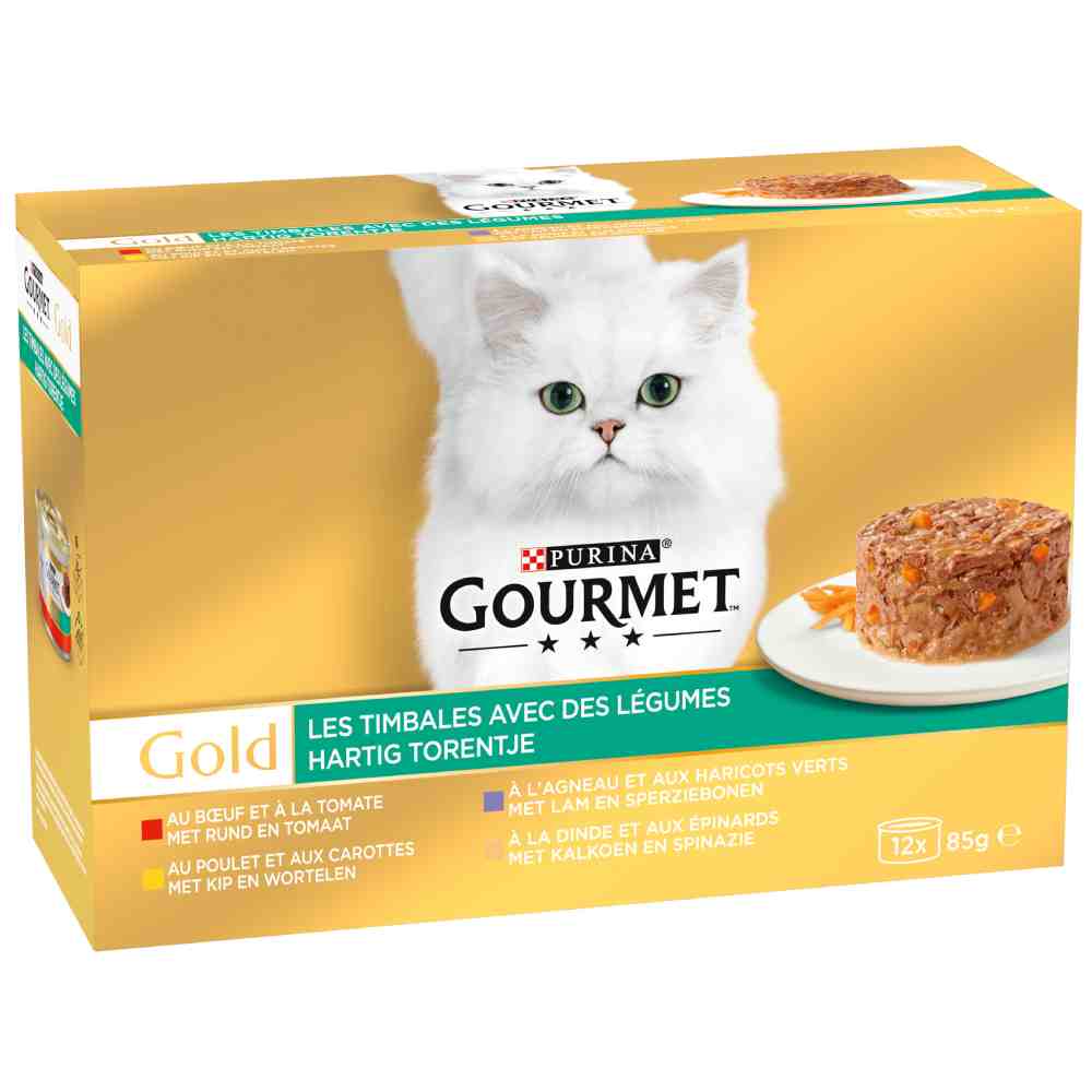Les chats sont de véritables petits gourmets et aiment avoir des repas variés. Ils adorent essayer différentes saveurs et textures, c’est pourquoi Gourmet Gold vous propose des recettes variées pour leur plus grand bonheur. Les boîtes Gourmet Gold Timbales sont préparées avec des ingrédients de qualité pour faire vivre à votre petit compagnon des expériences gustatives uniques. Votre chat appréciera ces menus exquis à base de fins émincés de bœuf, de poulet, de saumon ou d’autres saveurs, le tout dans une savoureuse sauce. Cette nourriture complète et équilibrée permet de couvrir 100 % des besoins nutritionnels quotidiens des chats. Gourmet Gold Timbales : le plaisir à chaque bouchée ! Le lot sélection mixte aux légumes contient : 3 x…